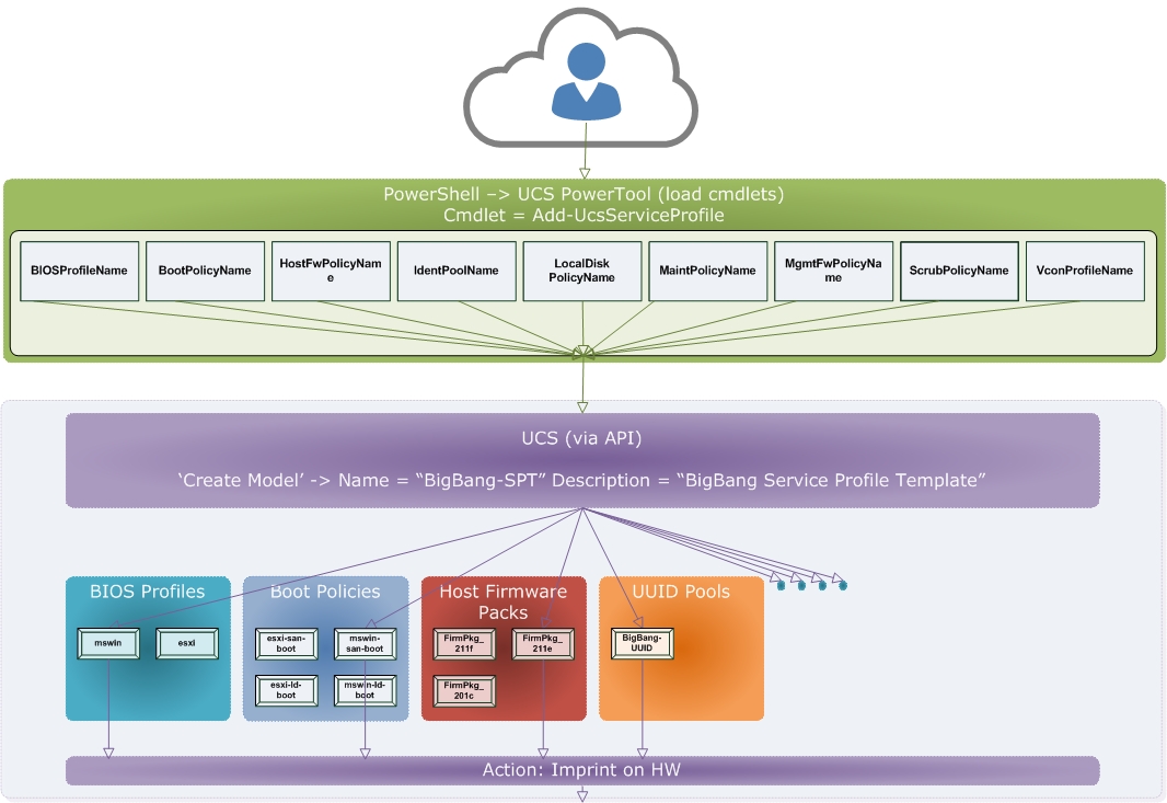 We essentially have an application above which is written in PowerShell.  The application’s purpose is to instruct a UCS system, via its HTTP-based API (‘connection-to-UCS’ lines are omitted), to create policy associated with characteristics defined using variables by the application’s user.  Those variables, in some cases, refer to the pre-defined ‘modular and re-usable building blocks’ mentioned -> e.g. A “MSWin-Ethernet” QoS Policy can be picked out in the above.  This may be one of many pre-defined QoS policies…  We have an example ‘boxed-up’ automation of a provisioning action which induces a shift towards a provisioning model that aligns to: