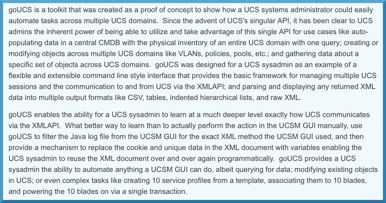 Where to start?  First a snapshot of what goUCS is in a little more detail… I’ll copy and paste this because… well, it’s easier: