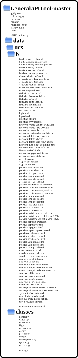Each of the arrows above has a pointer aimed at an inheritance statement (identified as an “import” line).  The inheritance of a given function is basically in the opposite direction to the pointer; the class is ‘sucking in’ what it’s pointing at.  If we were to add a new system, such as Prime Network Services Controller, Prime Data Center Network Manager, Nexus 1000v (VSM), etc. we would add directories under data folder in line with that system.  E.g. Nexus could be ‘/data/nexus/classes/’ + ‘/data/nexus/xml/’ with classes and XML broken down as appropriate.  The new system would then be imported and added into a new class using main.py as a guide.