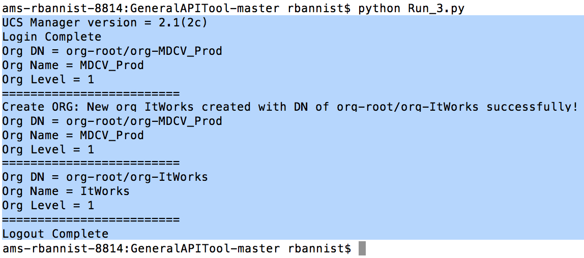 UCSInfoWe now have a valid starting point for the application as far as managing UCS is concerned.  What’s all of this endless code in main.py though?  Well, it’s actually ‘everything you would ever want to do with UCS’ and the reality is that you may only want to do a subset of what’s been coded.  So, the second step is actually to make a copy of main.py and give the new file any name that you want.