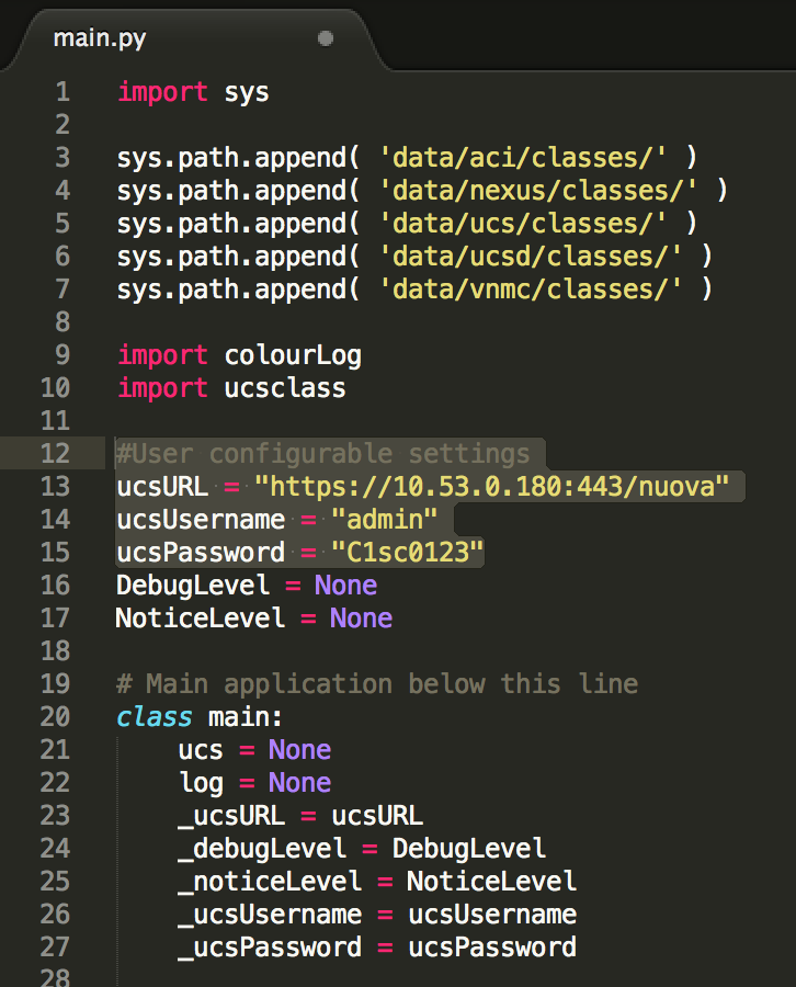 Let’s walk through some of the diagram briefly…  All of the purple modules are Python modules and they each do a particular pre-built ‘standardised’ function that some of the newly written classes reference.  e.g. urllib2 offers a pre-built way to interface with a HTTP-based API (i.e. REST or SOAP) as it’s a library for opening URLs.  The hyperlinks listed further up in this post provide extra details on those default modules.  We then move onto the application’s classes written for this app.  The “main” class is where you drive the app from (in this case it has code populated for UCS).  It has an ability to log including error logs so that explains the arrows to the appropriate module + class.  For “main” to drive things it relies upon an understanding of the managed system.  The import of “ucsclass” gives it that logic for UCS.  “ucsclass” then in-turn pulls on the logic of more specific ‘UCS sub-function’ classes; hierarchical and modular in a logical sense.  It also logs errors…  Lastly, the only other newly written classes unaccounted for are “myFunctions” and “XMLFunctions”.  “myFunctions” is the engine that delivers XML to a system.  It makes use of “XMLFunctions” which is a class used to load, capture and manipulate XML.  Manipulate?  We need to manipulate XML because of the authentication mechanisms built into the way many APIs work.  In the case of UCS a successful login gets a CookieID sent back in the response from the UCS system.  The same CookieID then has to be present in every other request to the system otherwise it seen as an unauthenticated session.  “XMLFunctions” does the relevant parsing and editing to make that work.  Both “myFunctions” and “XMLFunctions” also need to log errors…